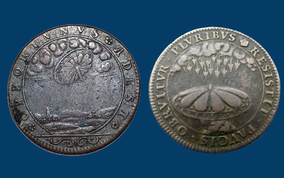 Pozoruhodné jsou též francouzké mince ze 17.století, kde je tento objekt také zřetelně vidět. Mnozí badatelé považují tyto nebeské úkazy za vyjádření Ezechielova kola, ale jiní mají více prostá vysvětlení. Fotografický analytik Marc DeAntonio ( MUFON ) tvrdí, že se nejedná o nic jiného, než skutečný vojenský štít. Prozkoumal prý období Francie 16.století a zjistil, že vojenské štíty tehdy přesně tak vypadaly. V roce 1680 byla občanská válka aristokracie byla nahrazena absolutní monarchií krále Ludvíka XIV. Na počest jeho moci byl štít vyobrazen na mincích. Každopádně zajímavé myšlenky na obou stranách spektra a každý si musí udělat svůj vlastní závěr.